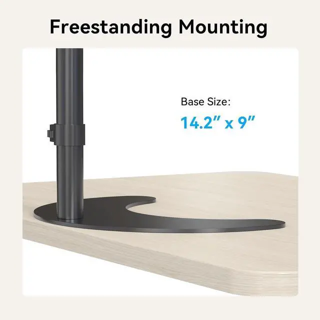 [THREE WAYS TO MOUNT] This monitor stand can be installed in 3 different ways to accommodate your needs. 1.Heavy duty & movable free standing base installation 2. Grommet installation (max thickness 2.36"/60mm) on any working surface 3. Grom