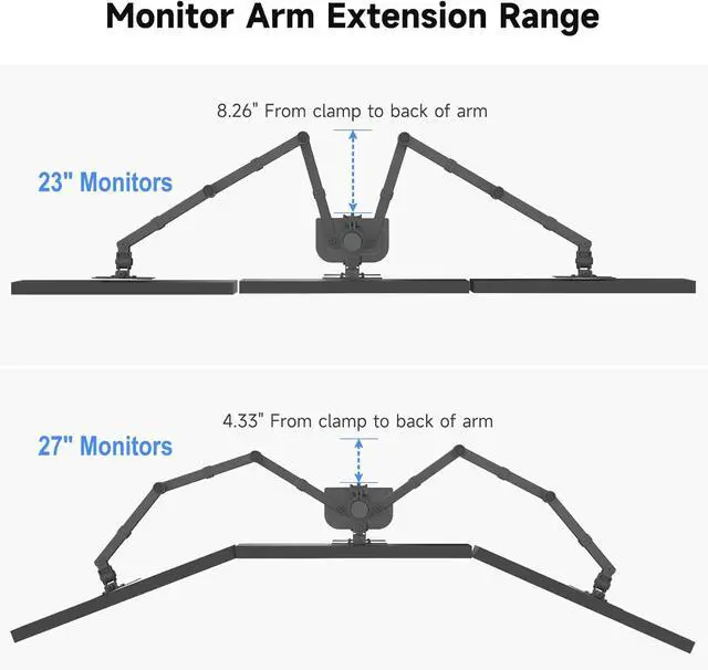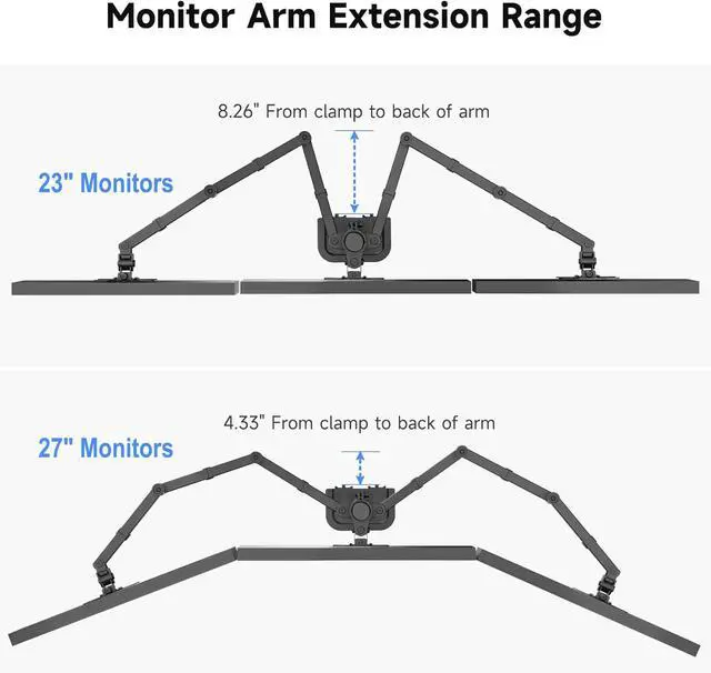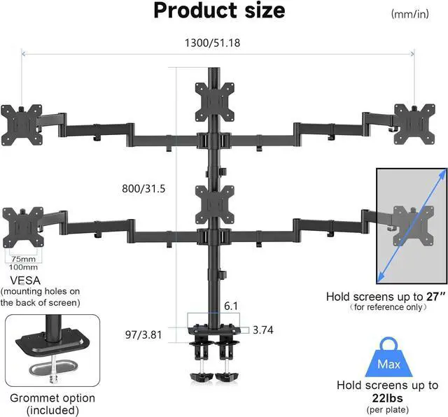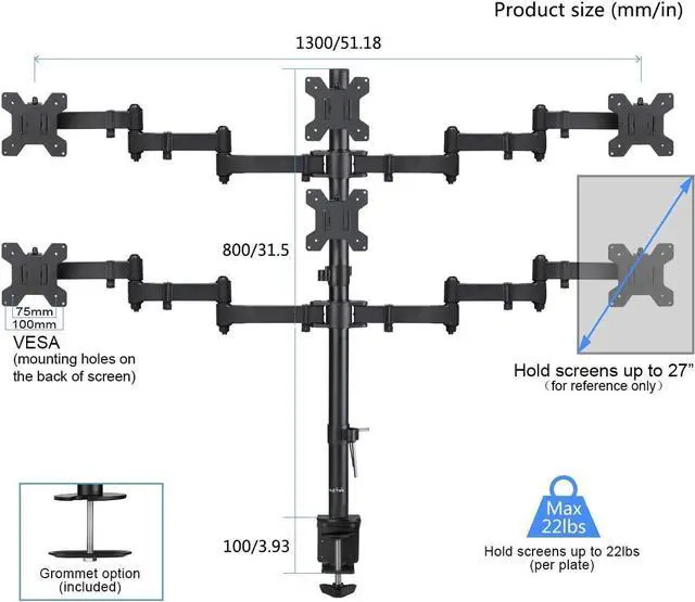 Compatibility - Hex monitor mount ideal for most screens up to 27" and 22lbs each with 75x75mm or 100x100mm backside mounting holes.