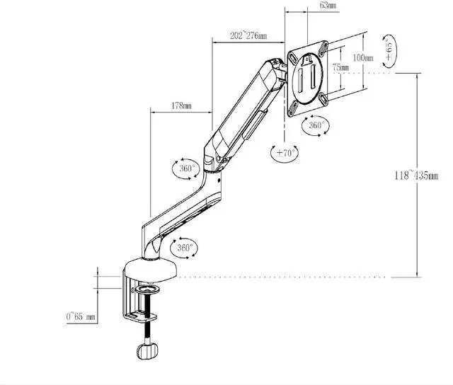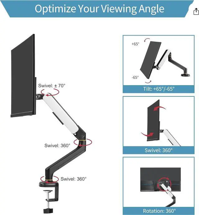 Ergonomic: The single monitor arm offers exceptional flexibility, allowing for a 360° screen rotation, 180° swivel, and tilt range of +65°~-65°. This feature significantly enhances both comfort and productivity. Whether you're using a 32 inch monitor, a monitor stand for desk, or a 22 inch monitor, this arm ensures you can adjust your computer monitor for optimal viewing angles.