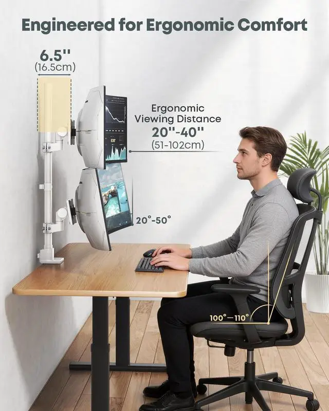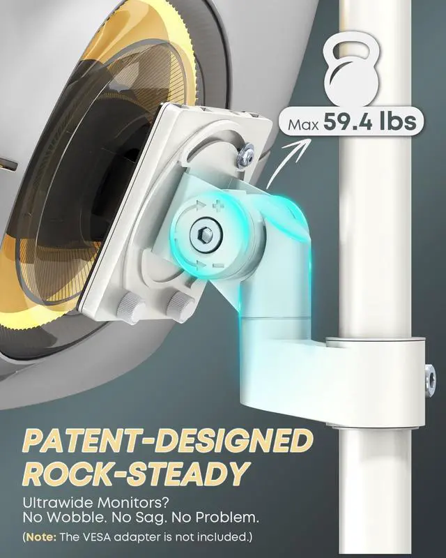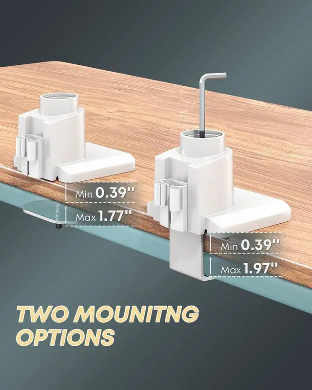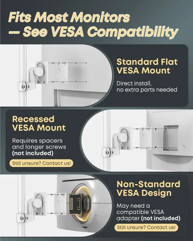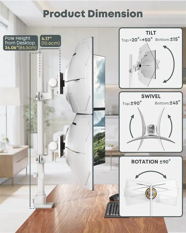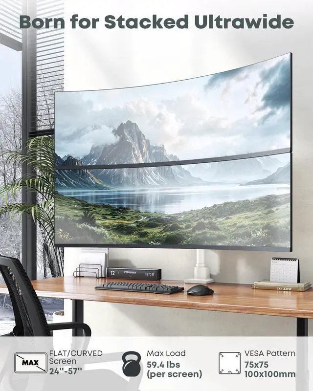 Material: Aluminum Surface Finish: Powder Coating Color: White Fit Screen Size: 24 inch to 57 inch Fit Curved Monitor: Yes Weight Capacity (for flat screen): 2 - 27 kg (4.4 lbs - 59.4 lbs) Weight Capacity (for curved screen): 2 - 22 kg (4.4 lbs - 48.4 lbs) VESA Compatible: 75 x 75 mm,100 x 100 mm Tilt Range: -20° - +20° Swivel Range: -90° - +90° Screen Rotation: -90° - +90° Installation: Clamp, Grommet Suggested Desktop Thickness: Clamp (0.39" - 1.97"); Grommet (0.39" - 1.77") Quick Release VESA Plate: Yes Cable Management: Yes