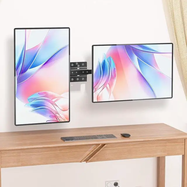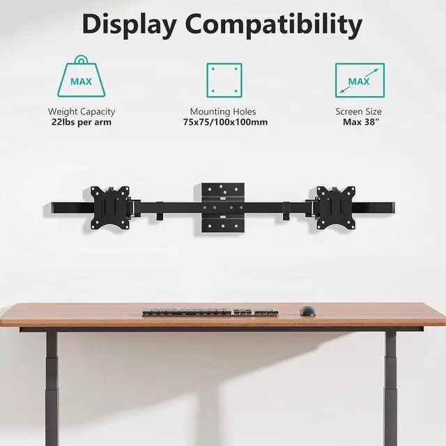 These dual monitor arms can be wall mounted to securely hold two screens. Fits normal and ultra-wide monitor screens up to 38".