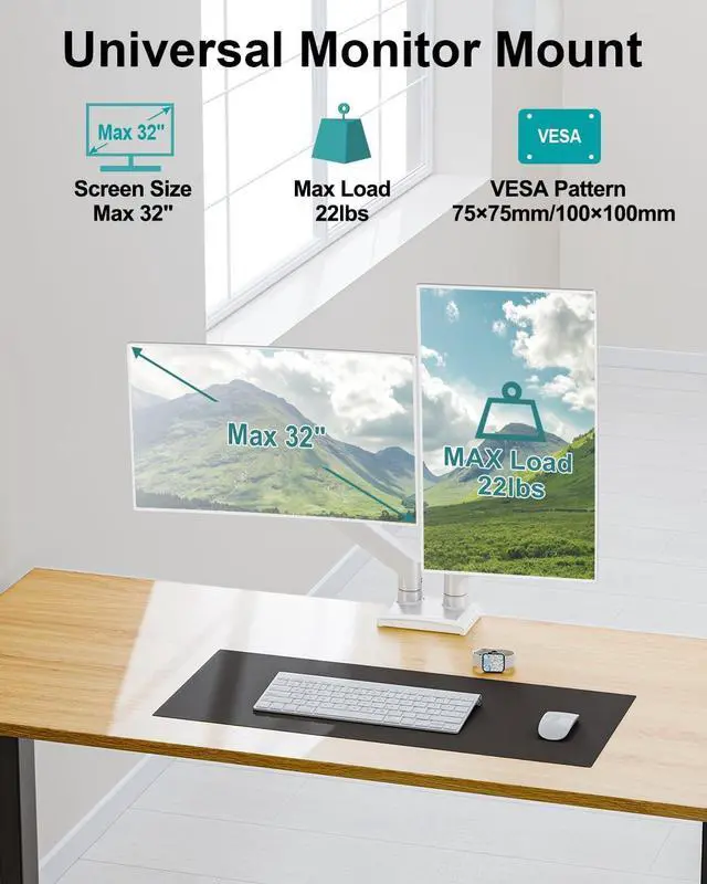 Universal for 2 monitors - The dual monitor mount is compatible with 13 to 32 inch monitors and holds computer screens from 4.4 to 22 lbs. Compatible with VESA 75x75 and 100x100 mm patterns, but not compatible with 1000R/1500R/1800R curved screens. Please kindly check your monitor before purchase. If you are in doubt about the suitability, please freely contact us with monitor information