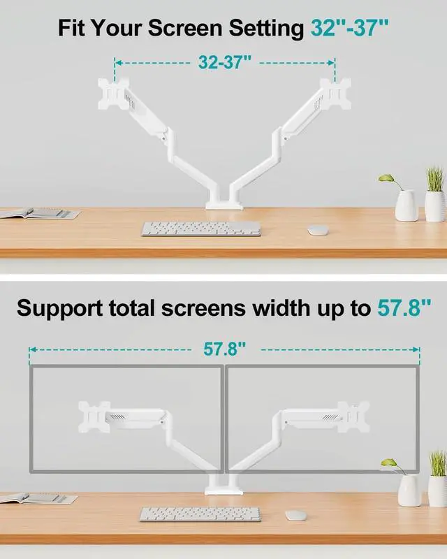 Clear Up Desk Space - The hidden cable management can keep your desktop cleaner and tidier. And the double monitor arm can lift 2 screens off the desk to free up more than 80% desktop space, so that you can place more accessories to create a more comfortable work environment