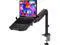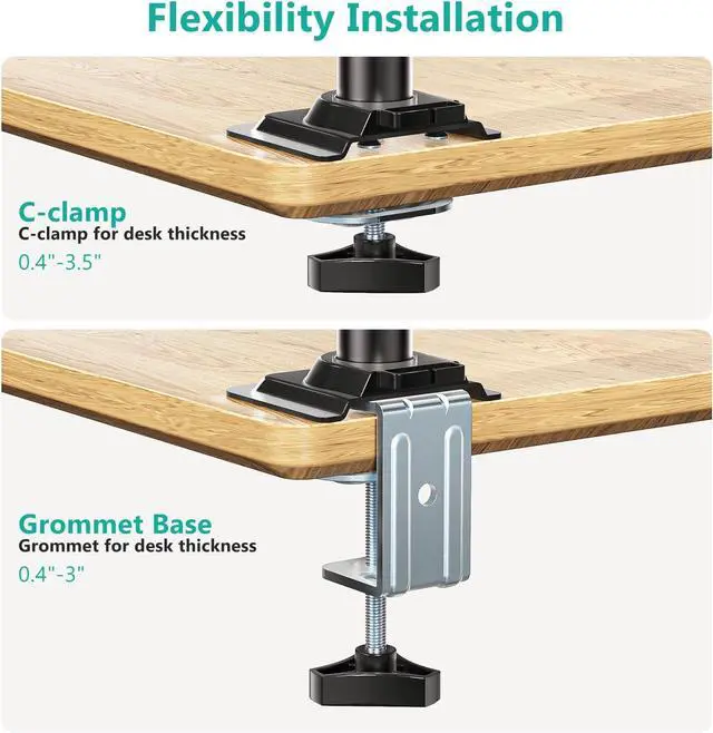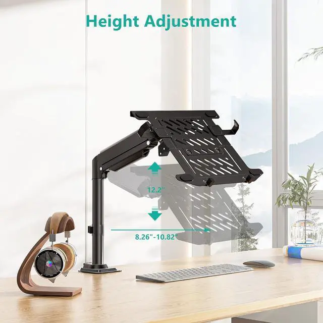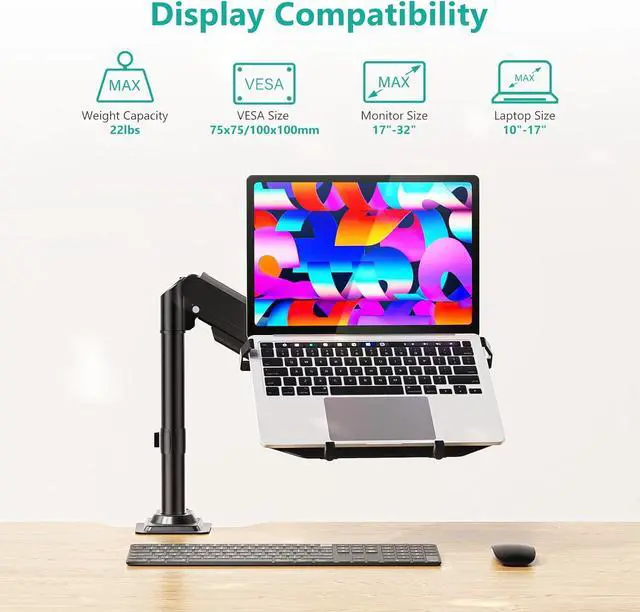 Enhance your workspace efficiency with our expertly designed Laptop Desk Mount, engineered for versatility and optimal performance. This laptop mount is compatible with laptops ranging from 10 to 15.6 and supports monitors between 17 to 32, accommodating a total weight of up to 22 lbs. The detachable and height-adjustable mount plates ensure a seamless fit for both laptops and screens, while dual mounting options cater to diverse setups, featuring mounting holes of 75x75mm and 100x100mm. Laptop Desk Mount is versatile and secure, equipped with a C-clamp suitable for desks with a thickness of 0.39 to 2.76 and a Grommet mount for desks measuring 0.39 to 1.97. This guarantees a stable fit across various desk types, making it an ideal choice for any workspace. Adjustability is key to comfort, and high-grade arms deliver just that. With an impressive 16 height adjustment capability, +70°/-45° tilt, +/-90° swivel, and a full 360° rotation, you can effortlessly customize your viewing angle to optimize comfort and productivity. Designed with cooling in mind, our Laptop Desk Mount features venting holes on the laptop tray to promote airflow from your laptop fan, maintaining peak performance even during heavy tasks. The generously sized tray measures 11.61 x 11.22 inches and includes a convenient 2.3 lip to secure your devices. Transform your workspace today with our Laptop Desk Mountwhere ergonomics meet functionality for a better working environment.