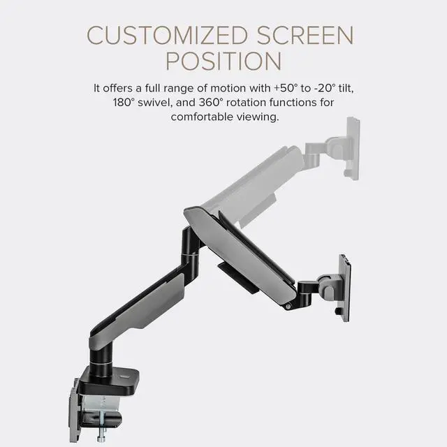 FULLY ADJUSTABLE: Along with being height adjustable, you can adjust this LCD monitor desk mount to a variety of angles along the arm. This monitor can be tilted up and down by 40°, and also swiveled by 90°-180° at various points down the arm, so you can truly tailor your experience to you.
