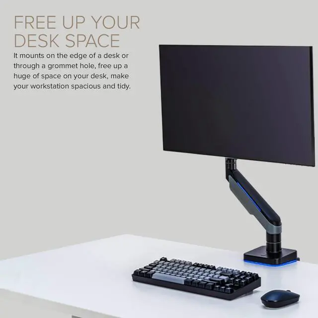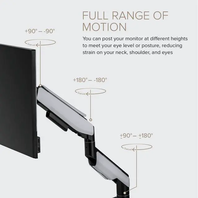 FREE UP SPACE: The articulating spring lift in this VESA arm mount not only helps to make work more comfortable but also aids you in freeing up valuable desk space. Not only will it remove the need for a monitor stand, but this single-arm mount also features a handy cable management cover.