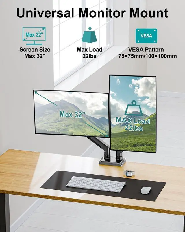 Universal for 2 monitors - The dual monitor mount is compatible with 13 to 32 inch monitors and holds computer screens from 4.4 to 22 lbs. Compatible with VESA 75x75 and 100x100 mm patterns, but not compatible with 1000R/1500R/1800R curved screens. Please kindly check your monitor before purchase. If you are in doubt about the suitability, please freely contact us with monitor information