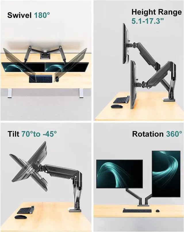 Clear Up Desk Space - The hidden cable management can keep your desktop cleaner and tidier. And the double monitor arm can lift 2 screens off the desk to free up more than 80% desktop space, so that you can place more accessories to create a more comfortable work environment