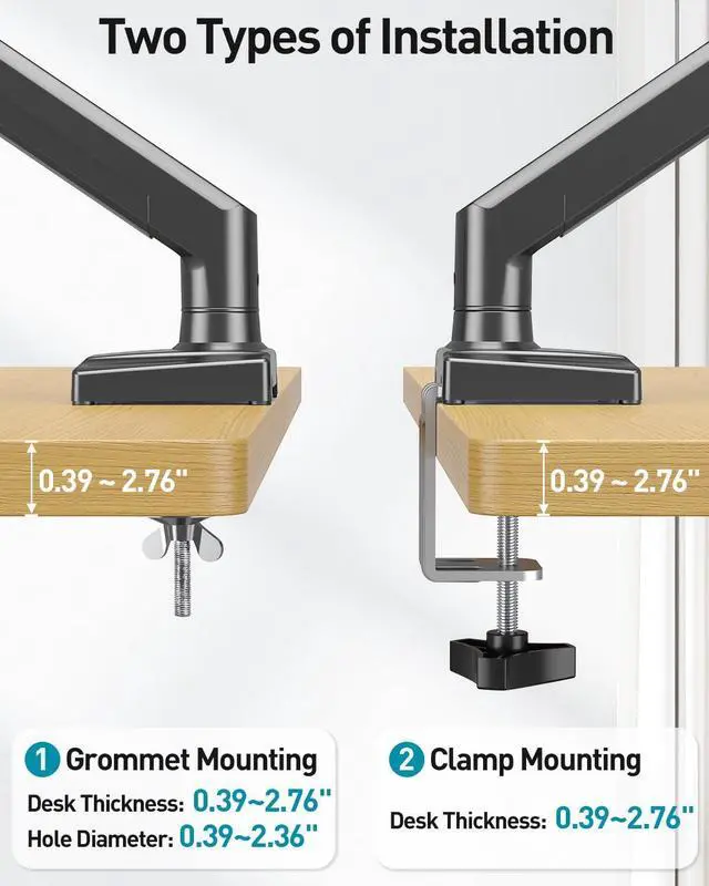 2 Way to Install - The desk mount monitor arm has two desktop installation methods as long as your table thickness is within the 0.39 to 2.76 inch range. You can install it with a C-clamp or grommet mount. No professional help needed, comes with all hardware accessories, less than 15 minutes from opening box to use
