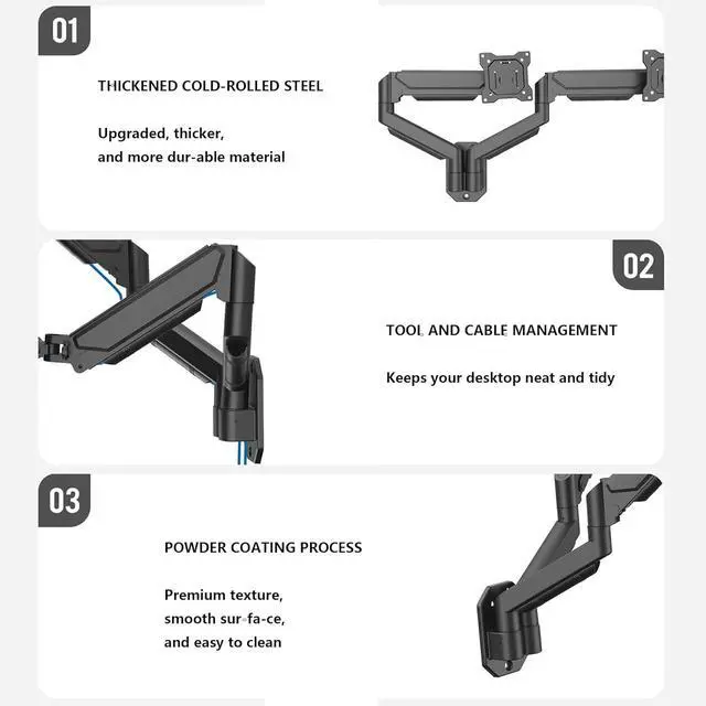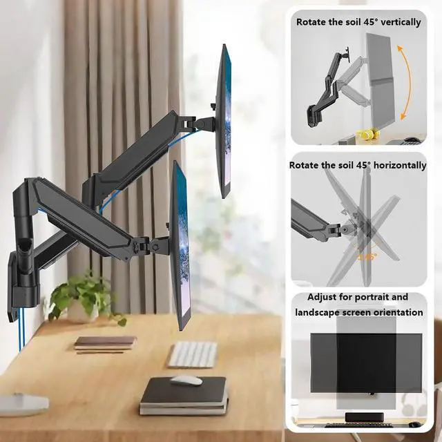MAXIMIZE DESK SPACE: Fr-ee up valuable desk space with this dual wall mount monitor stand. By mounting your monitors on the wall, you keep your workstation spacious and clutter-fr-ee. Plus, the built-in cable management keeps your power cords organized and out of sight