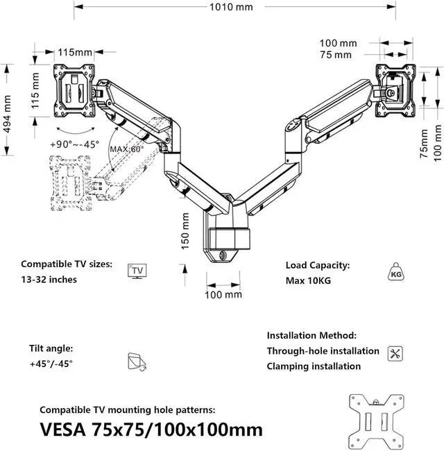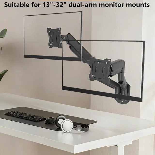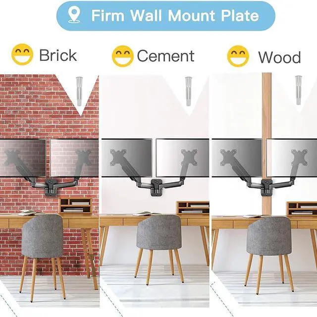 WIDELY COMPATIBLE: This dual-monitor wall mount can mount screens ranging in size from 17" to 27" and supports up to 17.6 lbs per arm. It's compatible with 75x75 or 100x100mm VESA patterns. This wall mount monitor stand can be securely installed on wood studs, solid concrete, and brick, ensuring your monitors stay safe and stable