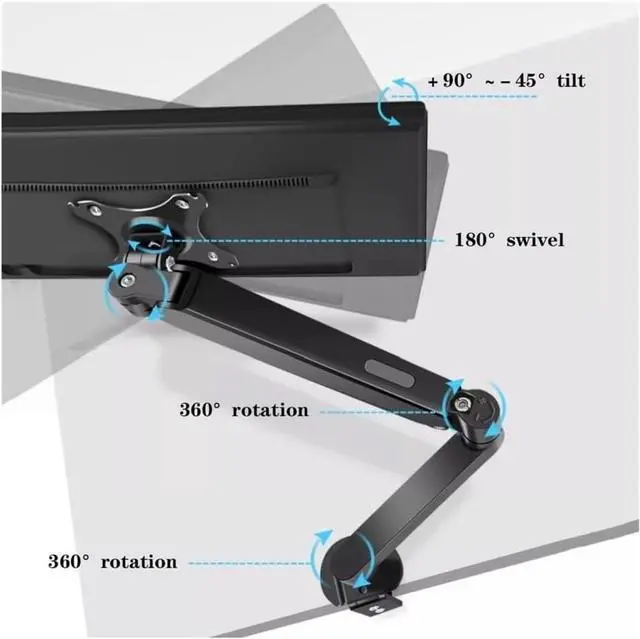 Easy height adjustment, rotate 360°, tilt ±45° up and down, swivel 180° left and right.