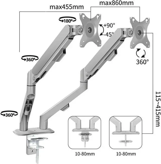 This dual monitor desk mount features +90°/-45° tilt up and down, 180° swivel, 360° rotation and 11.8" height range for superb flexibility, allowing you to place screen in the best view or elevate your monitor to relieve neck and back strain and optimizes desk space.