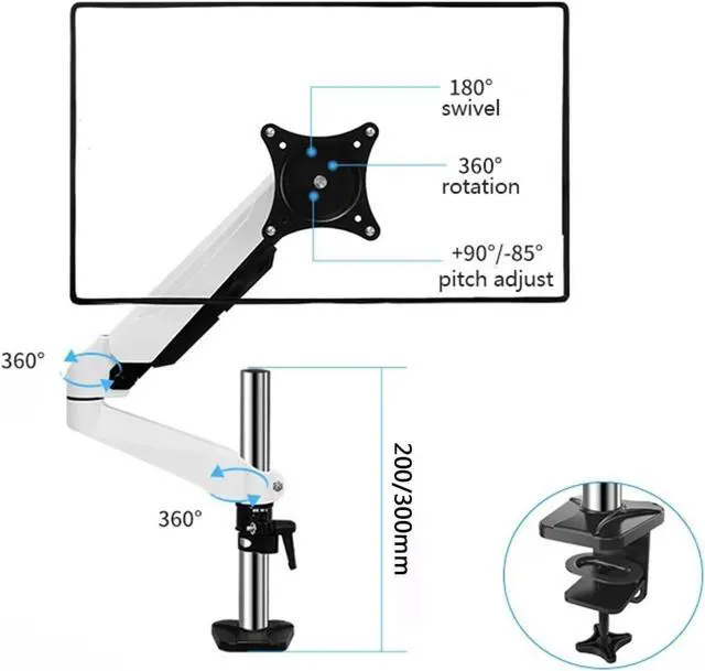 Fully Adjustable: The single monitor mount offers +90° to -85° tilt, 180° swivel, 360° rotation. Our vesa monitor mount is easy to adjust, just push the monitor arm up or down with only one hand to accurately stop at the most comfortable height for you!