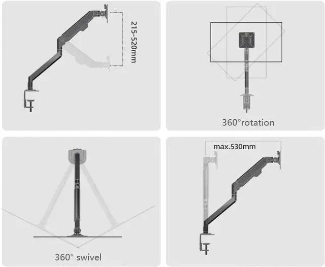 The single monitor mount adopts an Advanced Gas Spring System that offers a wide range of movement. Your monitors enable effortless adjustment with +90°to -90°tilt, 180°swivel, and 360°rotation, creating the most comfortable viewing angle for your work or game.