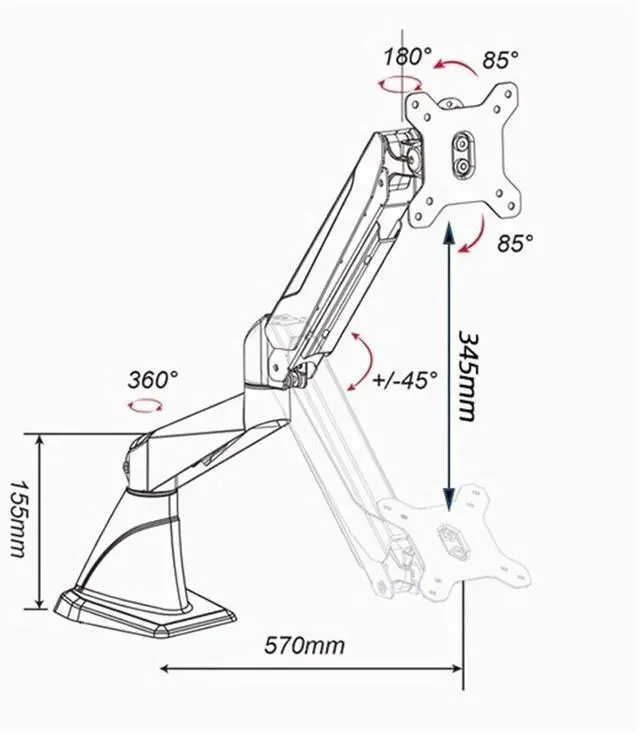 Full motion - Easy height adjustment, rotate 360°, tilt ±85° up and down, swivel ±180° left and right.