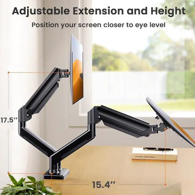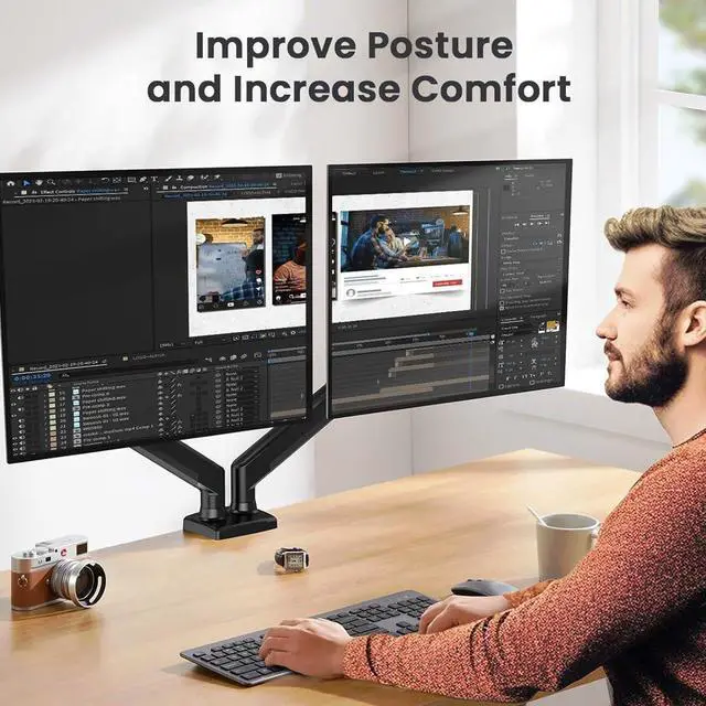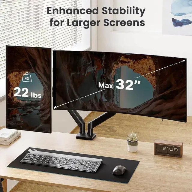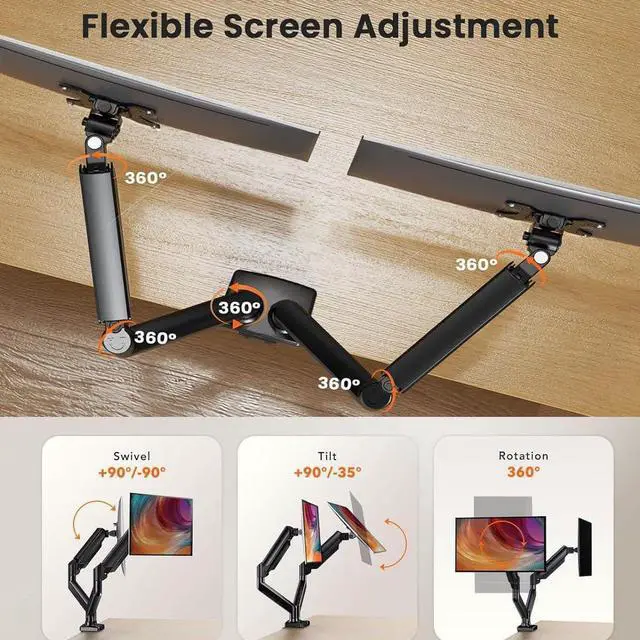 Crafted with aerospace-grade aluminum alloy and excellent design, our dual monitor stand can support up to 10kg on each arm with rock-solid stability. Mount your monitors with peace of mind knowing they will remain steadily in place without sag or wobble.