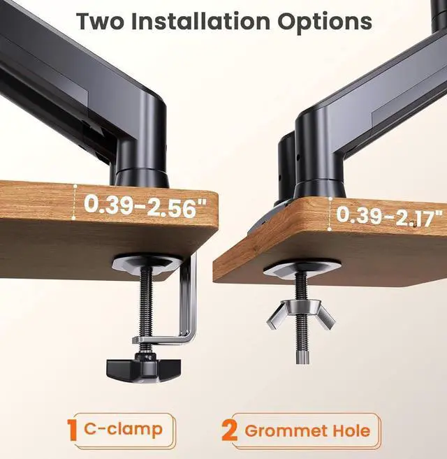 Choose C-clamp mounting for desks with 10 to 55mm thickness or opt for grommet hole mounting for desks with 10 to 65mm thickness. This monitor stands for 2 monitors Get set up in just 10 minutes with the included tools and instructions.