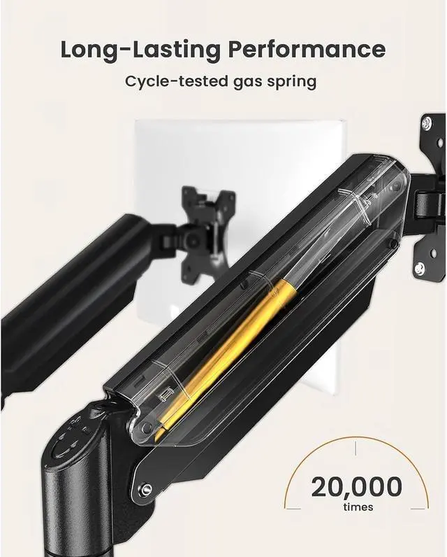 STRONG STRUCTURE & PROVEN DURABILITY: Built with aerospace-grade aluminum alloy and excellent design, our dual monitor stand can support up to 22 lbs on each arm. The strong construction keeps both of your large screens steady without wobble or sagging. It undergoes rigorous 20,000 times cycle tests for long-lasting reliability