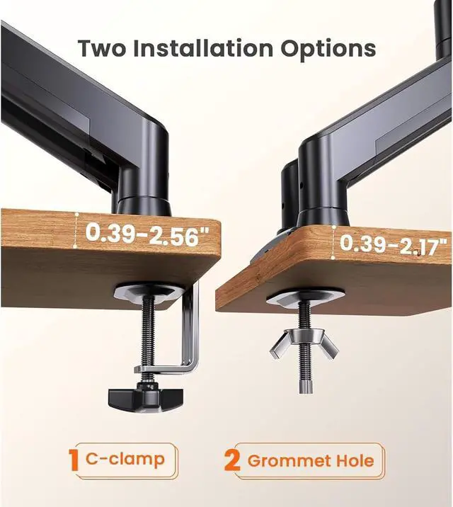 TWO EASY MOUNTING OPTIONS: Select the mounting option that fits your desk: C-clamp mount for 0.392.56 thick desks, or grommet mount for 0.392.17 thick desks. This monitor mount for 2 monitors is easy to set up in just 10 minutes using the included tools and easy-to-follow instructions.