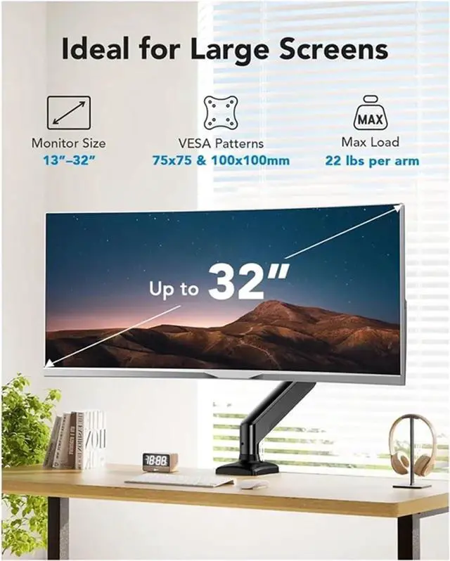 Fits Large 32 inch Screens: The computer single monitor stand is compatible with most 13 inch-32 inch flat or curved screens with VESA mounting patterns 75x75 or 100x100mm. The wide size range allows you to mount most monitors above the desktop to free up valuable desktop space