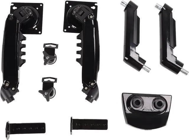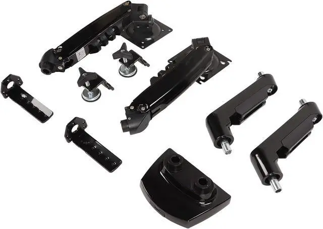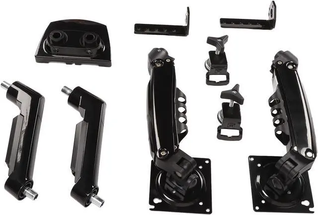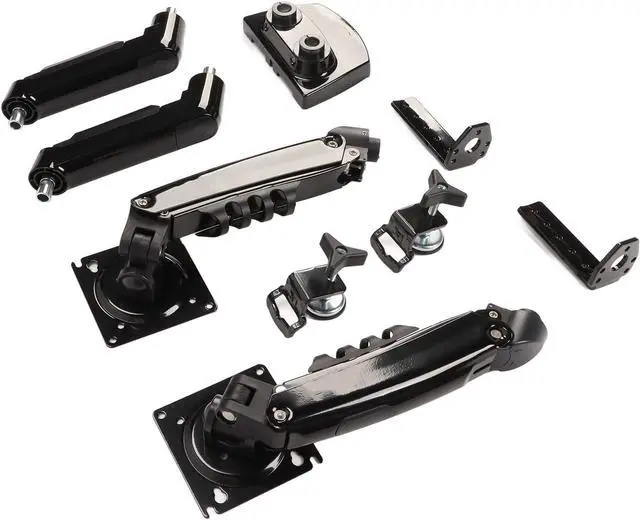 [COMPLETE PACKAGE] Kit includes two monitor stands, base, connection frames, C clamp, grommet mounting bases, screw kit, and manual.
