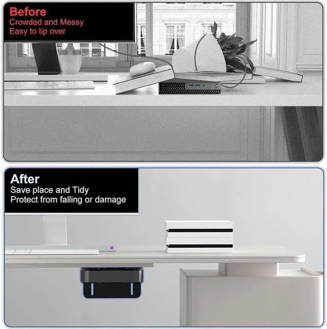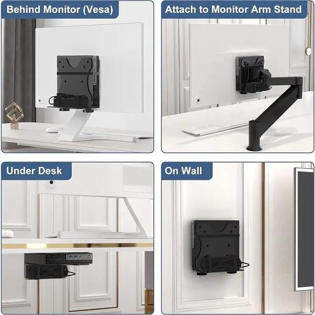 This computer mount integrates small computers into your workspace and supports installation on monitor mounts, under-desk mounts, desktop mounts, and wall mounts.