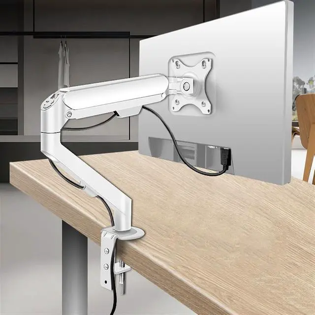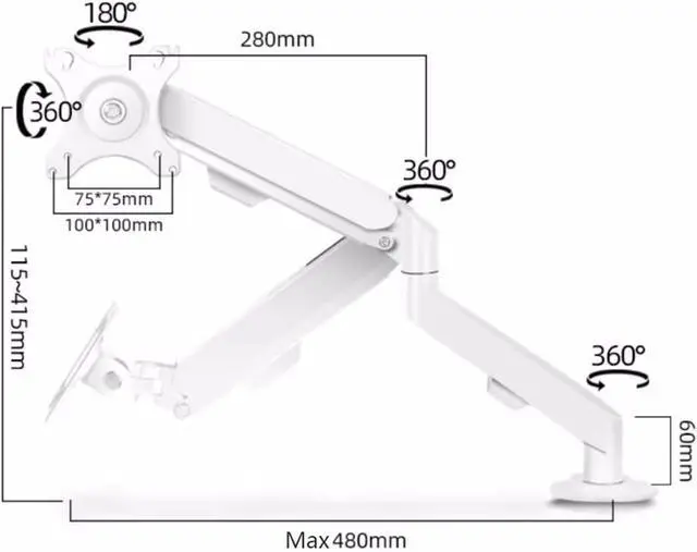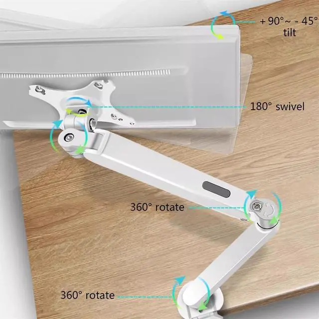 Easy to AdjustThis monitor desk mount with gas spring arms offer a wider range of movement. Single monitor desk mount arms can extend up to 18.9" long, and rise up to 16.33" in height. Easy to find the right viewing angle and position. Supports screen rotates 360° for landscape or portrait orientation, swivels 180° to share your display, and tilts up 90°/down 45° for better viewing.