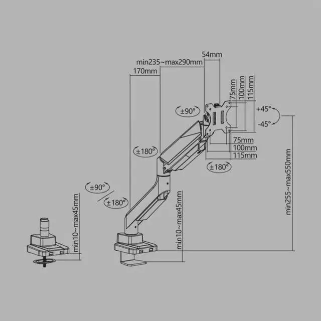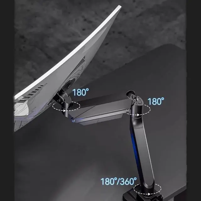 • This PC monitor stand can remain completely stable at any angle without any extra work. This gas spring monitor arm is easy to use and has a tilt range from -45°to +45°, ±90 ° swivel, and 360°rotation to find an optimal view angle to meet your demands.