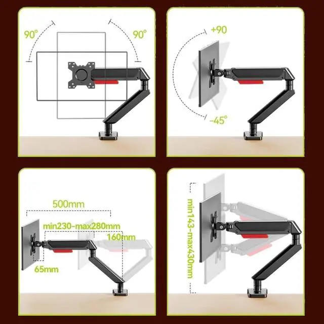 Adjustment: Experience ultimate comfort and flexibility with this adjustable monitor mount. Featuring 90° to -45° tilt, 180° swivel, and 360° rotation for landscape or portrait mode, you can easily find the perfect ergonomic position to help reduce discomfort and fatigue.