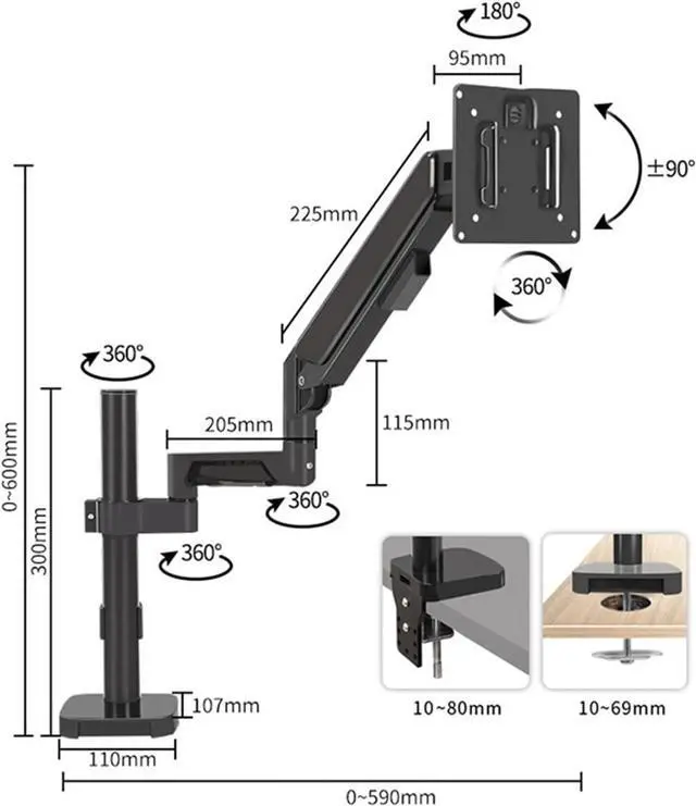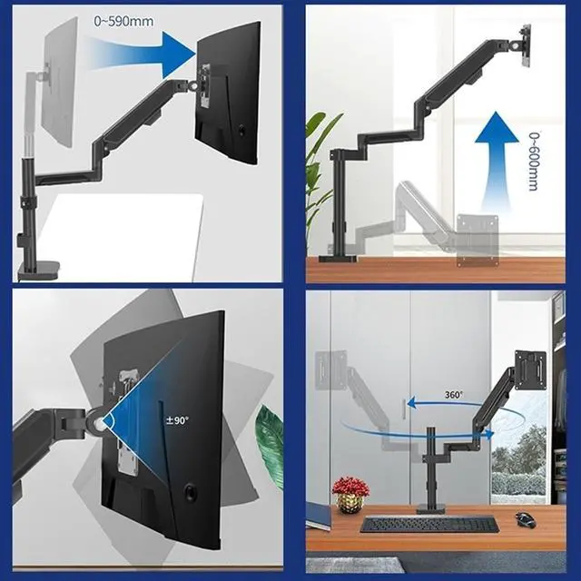 Fully Adjustable: The gas spring stand can tilt +90°/-90°, swivel +90°/-90°, and rotate 360°. Max height is up to 23.62", and max extension is up to 23.22".