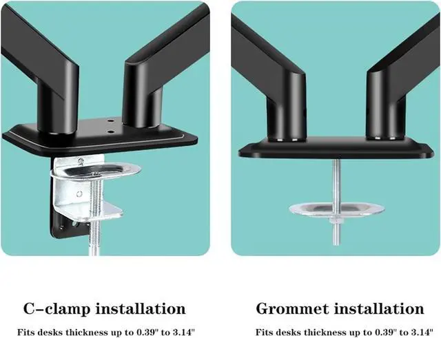 This monitor desk mount to offers two installation options to ensure stability and full functionality. The C-clamp and grommet base all fit a maximum desk thickness of 0.39-3.14 inches.