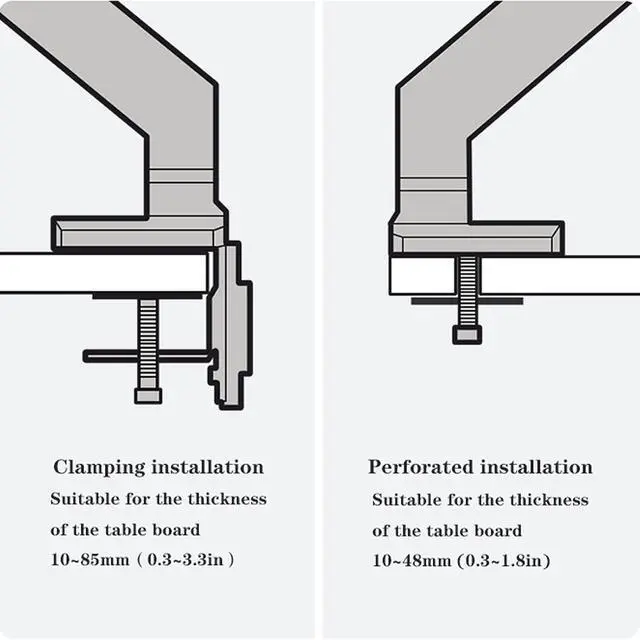 Two installation methods, clamping installation, suitable for table thickness 0.3-3.3 inches; perforation installation, suitable for table thickness 0.3-1.8 inches