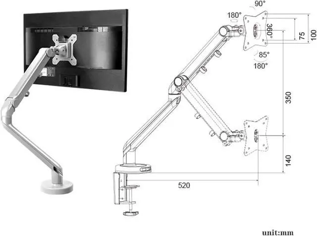 Single monitor stand easily adjust due to the mechanical spring system, raise, lower, pull, and push your monitor, including a max arm height of 19.29", up to 20.47" of arm extension, +90°/-85° monitor tilt, 180° swivel, and 360° rotation to find the perfect working position and most comfortable viewing angle.