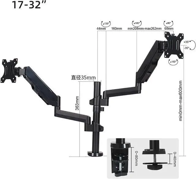 Double Monitor Mount Stand, Monitor Bracket for 17 to 32 Inch Monitor, Gas Spring Monitor Arm Holds Up to 17.6lbs/8kg Each, Fit 75x75/100x100mm