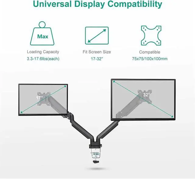 UNIVERSAL COMPATIBILITY - The monitor mount is designed for most 17 to 32 flat screen computer, hold up to 17.6lbs/9kg, compatible with VESA standard 75x75mm and 100x100mm.