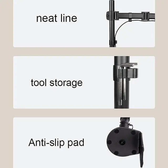 FREE UP YOUR DESK SPACE - Heavy-duty monitor arm with built-in cable control professionally helping to hide wires. The large screen is suspended, which can free up a complete desktop space and create a better working environment