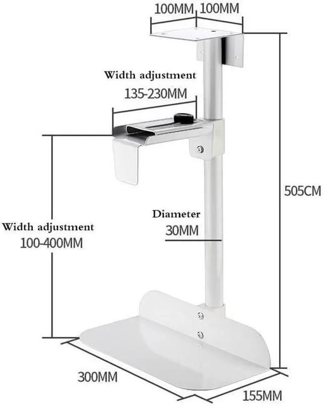 Adjustable frame, designed to fit most PC models on the market, with height adjustable from 4-16 inches and width adjustable from 5-10 inches.