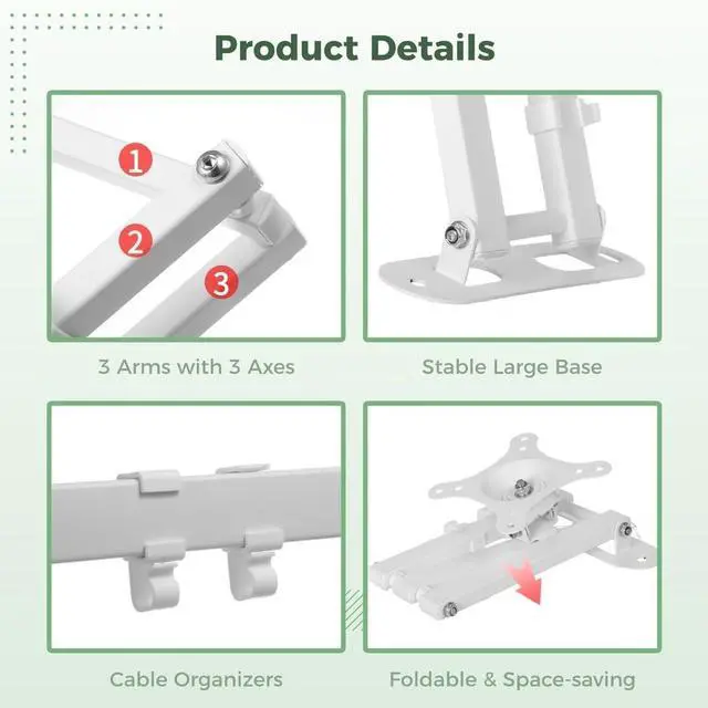 Space-saving and wire control: position this mount 3.5 to 16.5 in from the wall to maximize space; fold up when idle; the two organizers provided keep wires tidy, stopping display interference for looks and safety
