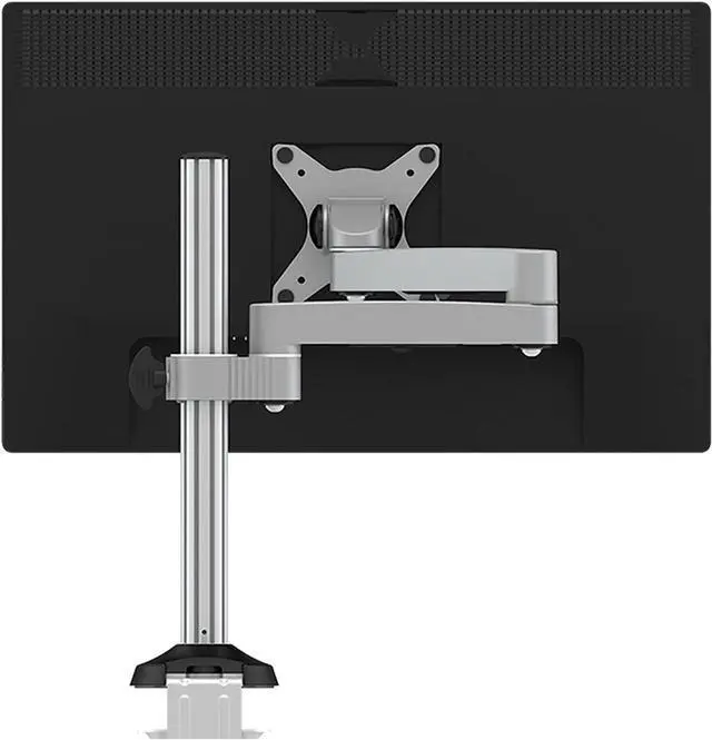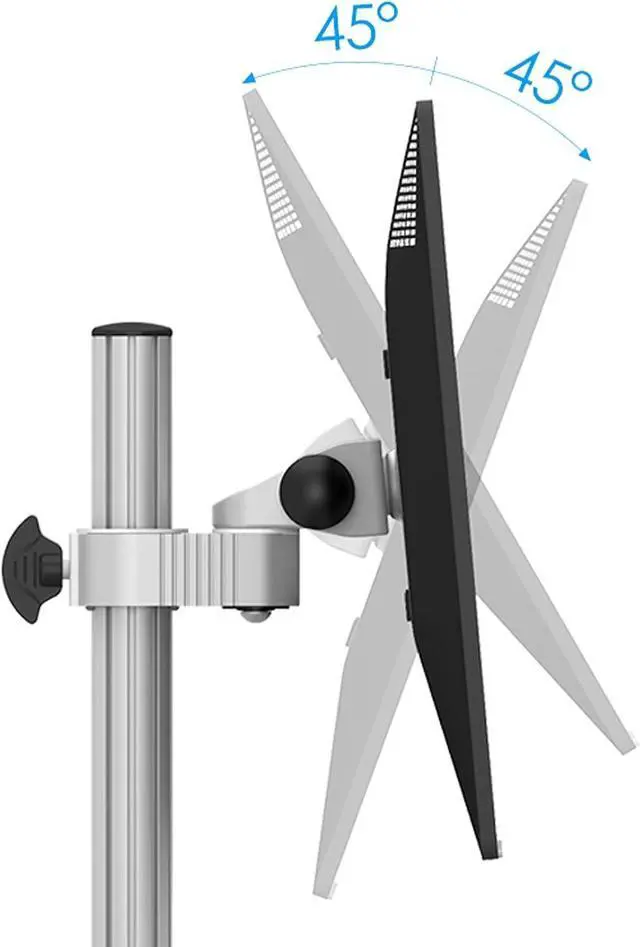 ? The adjustable arm provides +90° to -45° tilt, 360° rotating horizontal and vertical screen switching and height adjustment along the center pole. The display can be placed in portrait or landscape orientation