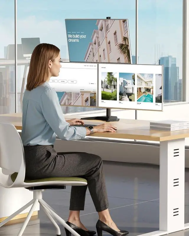 Find Your Perfect View: This triple monitor arm provides a complete range of motion, including tilt (-45° to +45°), swivel (-90° to +90°), and 360° rotation. Easy adjustments help you achieve an ergonomic viewing position, minimizing neck and eye strain, while its modern design fits any setting.