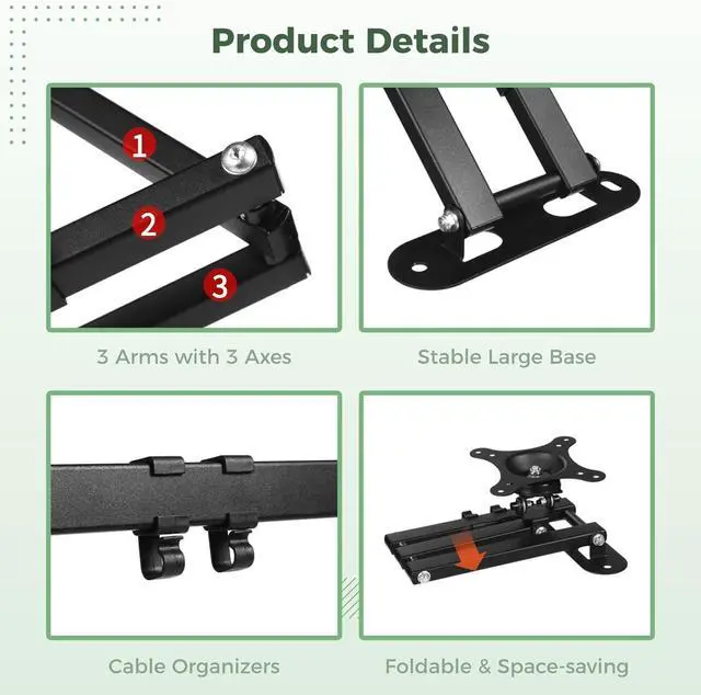 Space-saving design & cable organization: extends 3.5 to 16.5 in from the wall; folds flat when unused; two cable organizers keep wires neat