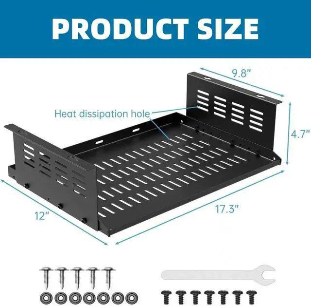 Spacious Vented PlatformThe under desk mount is 17.3"W × 4.2" H × 12 "D. Strategically placed vented slots boost air circulation around your devices components, effectively preventing overheating and ensuring optimal performance.