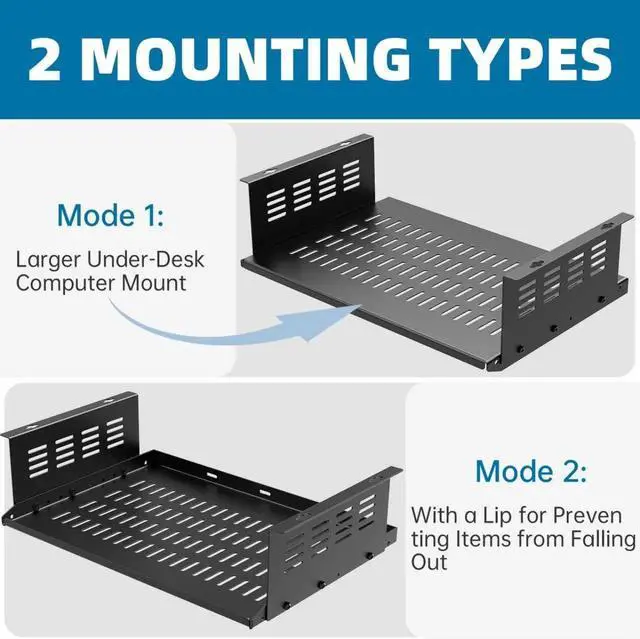 Under Desk MountingThis Computer Under Mount allows you to mount your computer horizontally to the underside of your desk, table or other stable surface. Its ideal for home offices, gaming setups, or any workspace where maximizing space is a priority