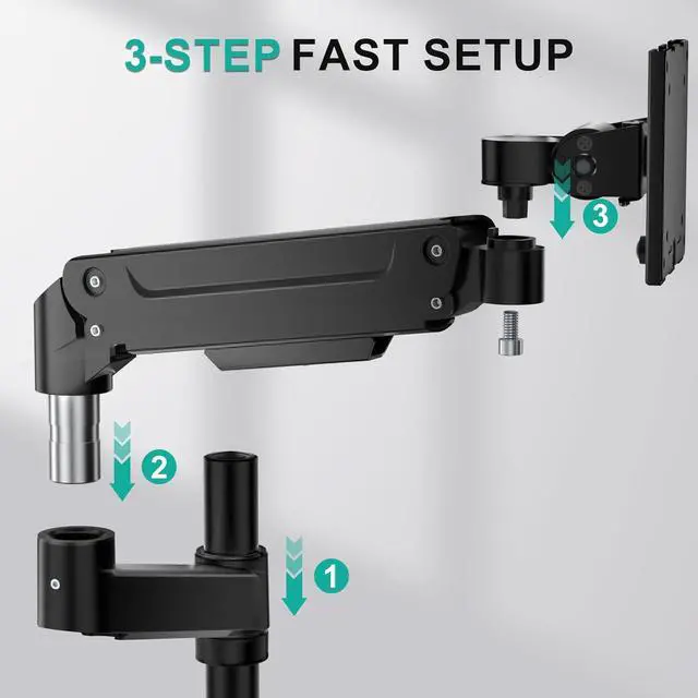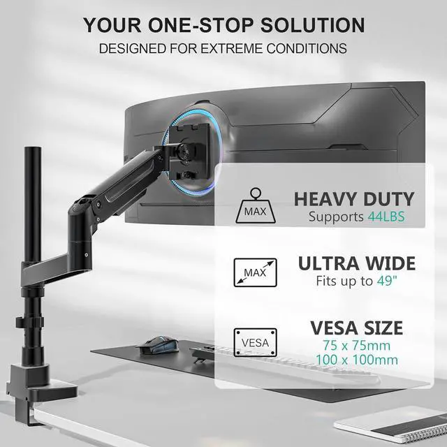 Ultra-wide Screen and Weight Compatibility: Constructed from durable materials, this single monitor arm supports screens from 13 to 49 inches and holds up to 44 lbs. Its universal 75x75mm and 100x100mm VESA mounting pattern ensures direct compatibility with the vast majority of monitors available, providing stable support.