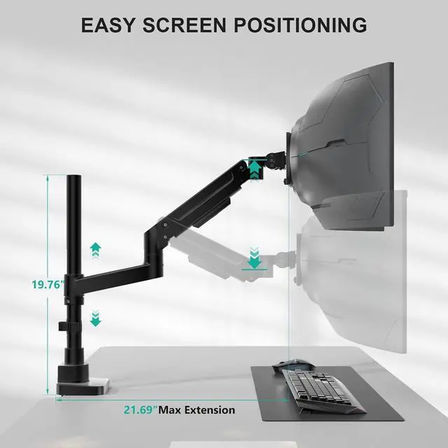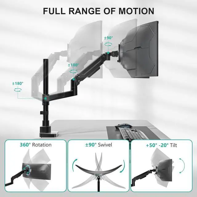 Multi-Directional Adjustments for Optimal Positioning: The monitor arm allows tilt (+50°/-20°), swivel (±90°), and 360° rotation, enabling easy switching between landscape and portrait orientations. This flexibility helps accommodate various tasks such as coding, document viewing, or web browsing.