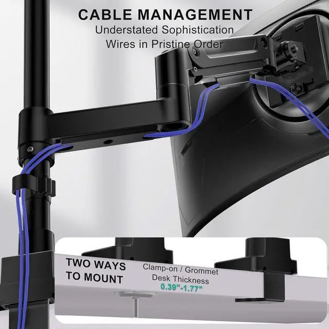 Mounting Options: A sturdy desk clamp provides excellent support, and an equally secure grommet mount is included to accommodate various desk layouts. The mount fits desks from 0.39 to 1.77 thick with either clamping style, clearing valuable desk surface to help maintain a clean and organized workspace.