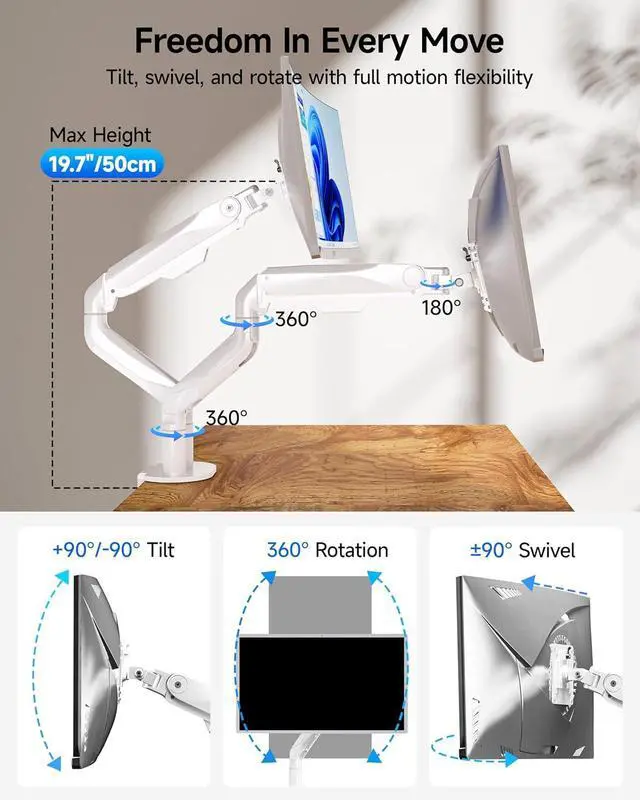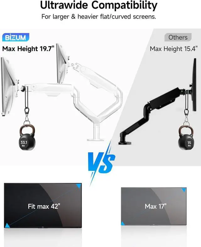 Ultrawide Compatibility: Universally compatible with most 17-inch to 43-inch flat and curved screens weighing from 6.6 lbs to 19.8 lbs each with VESA 75x75mm or 100x100mm mounting patterns