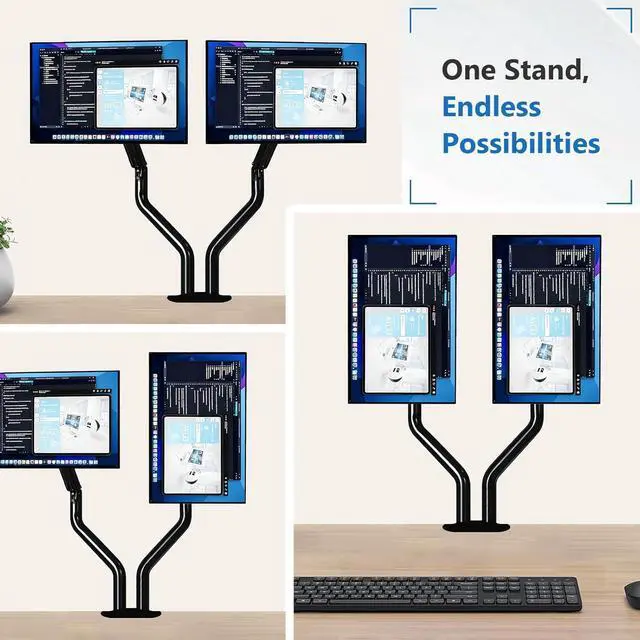 Space-Saving Design - Transform Your Desk with a 2 Monitor Desk Mount. This dual monitor mount lifts your screens off the desk, turning wasted space into usable areaideal for anyone tired of cluttered workspaces. As a monitor mounts solution, it lets you store keyboards, notebooks, or documents under the monitor arms for 2 monitors, keeping your desk neat. Whether you use it as a double monitor mount or two monitor desk mount, this dual monitor stand for desk maximizes your desks potential.