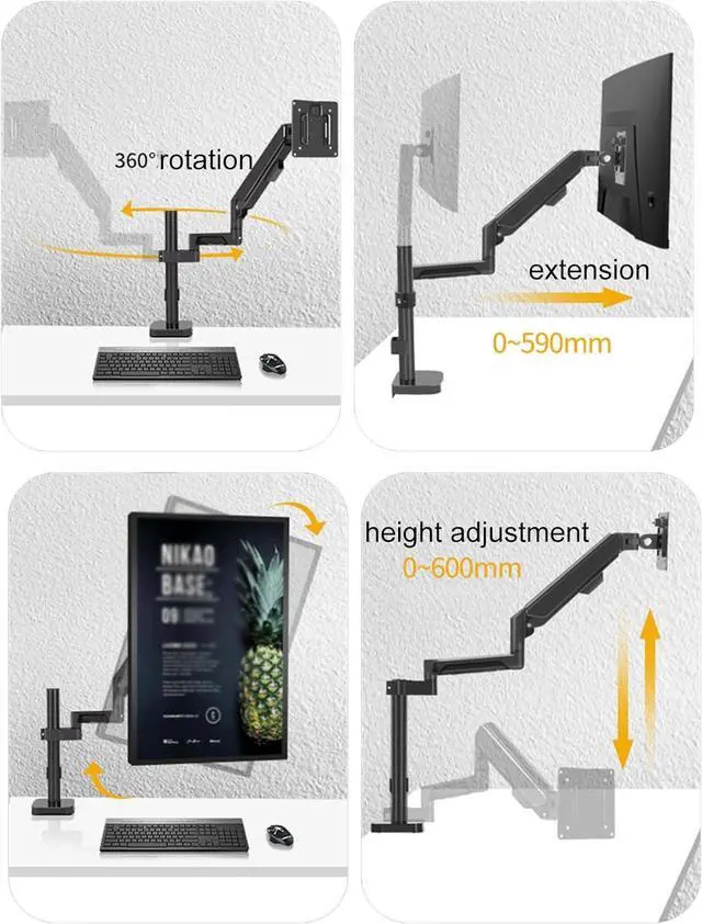 Fully Adjustable Single Monitor Stand : The single monitor mount offers +90° to -90° tilt, 180° swivel, 360° rotation. Our gas spring monitor mount is easy to adjust, just push the monitor arm up or down with only one hand to accurately stop at the most comfortable height for you (up to 60cm from the desktop).